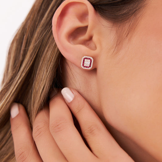 14k Baguette and Round Ruby Necklace with Halo Setting