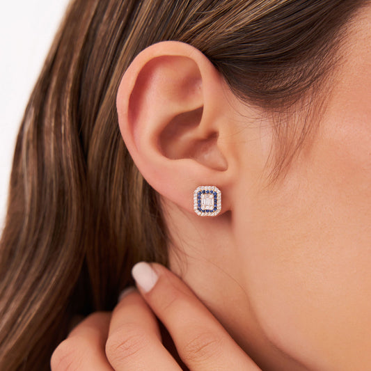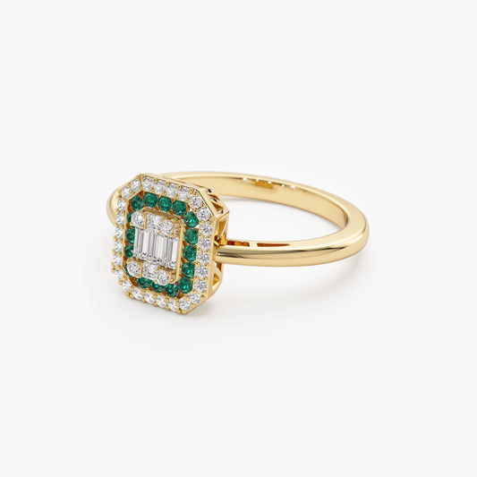 14k Baguette and Round Sapphire Ring with Halo Setting