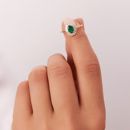 14k Baguette Diamond Ballerina Oval Emerald Ring